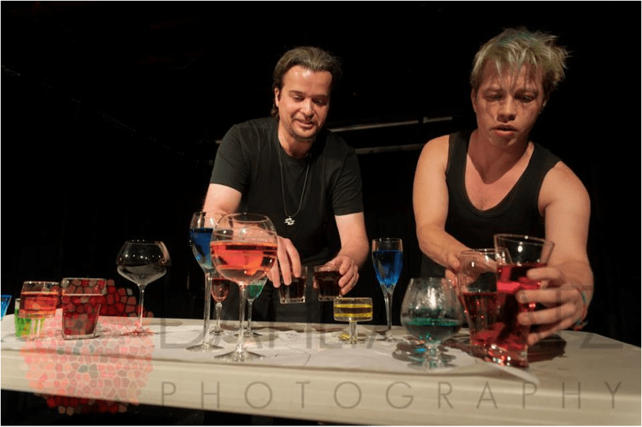 Everything seems mundane; just two people setting things up. Then, instead of a theatrical curtain raising, the narrative simply begins out of this dance. The work then weaves between abstraction and literalness of narrative: in front of the audience, glass-ware is filled with coloured water and animated to “become” a scene at a singles bar. There is no text besides the words “glass,” “metal,” and “Martini,” and with these words all personality and longings are conveyed. The water is drunk by the performers from the glasses when the characters “exit,” rendering the objects as glasses once more, and creating humour as the performers become wet and full. There is quite a bit of splashing.
