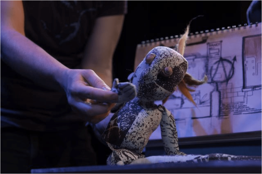 I designed the show with Carmen Gillespie. The table-top puppets are based on a design of Ann’s, adapted by myself and Gillespie. We choose to portray the story using current-era punk kids. This puppet, Lazy Harry, is very gangly limbed, compared to his companion Fat Trina, whose body is stronger and larger with a hole through her middle that she is always trying to fill with food. She is sassy and not ashamed that eating and “being fat” are a part of her. They are table-top puppet made from a couple of shirts found abandoned in a squat. The character has snail-shell eyes from the Don Valley. These shells and the narrator who is a snail speak to the theme of the story, which is preferring a slowing of life. Harry’s hair and ear-plugs were removable, to show when the character was becoming a punk.